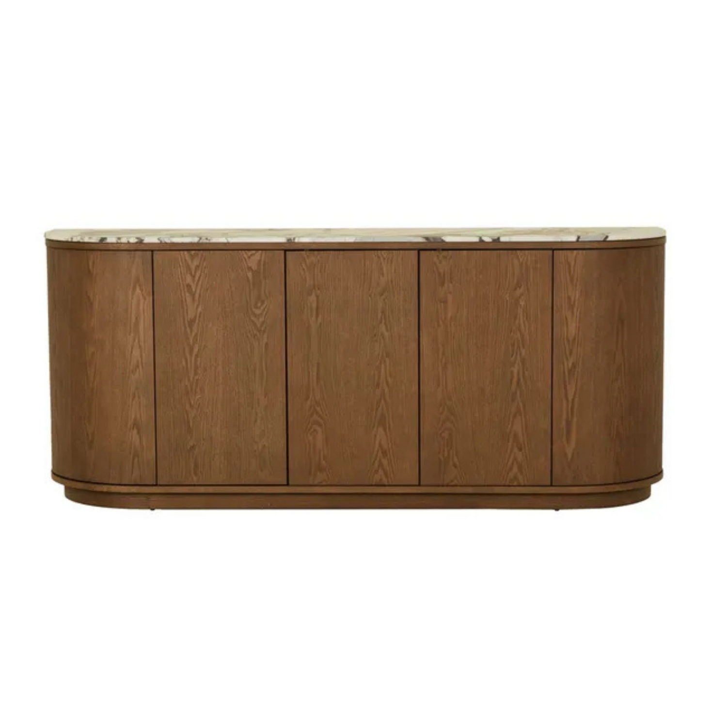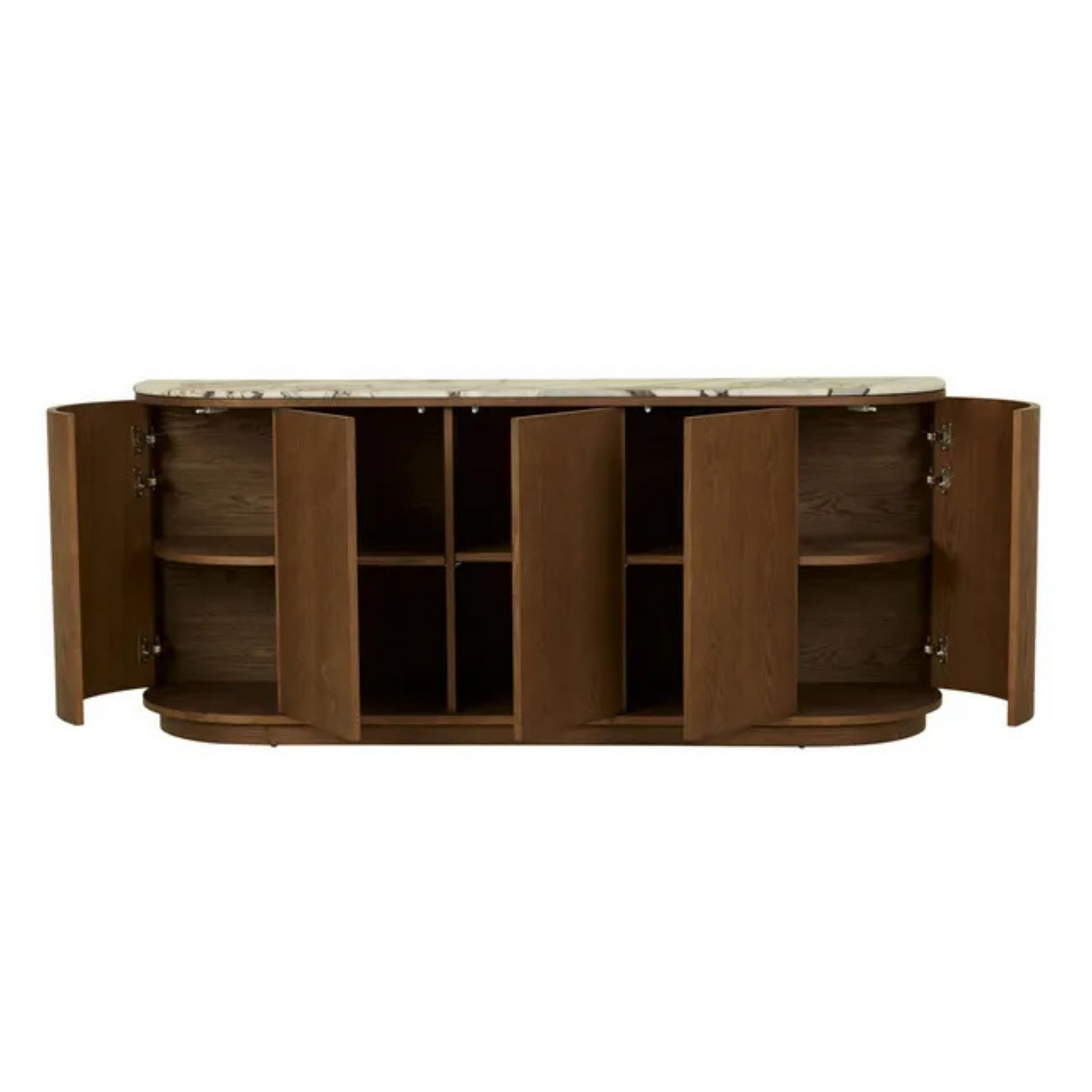 The Oberon Crescent Marble Buffet in Matt Ocean Marble and Smoked Ash epitomises contemporary sophistication. Featuring a minimalist ash veneer, curved doors and concealed storage on a plinth base, it offers both style and practicality. The marble top and Hettich hardware adds a touch of luxury, making it a standout piece in modern dining areas. Ideal for elegant interiors, this buffet enhances the overall aesthetic with its refined design.