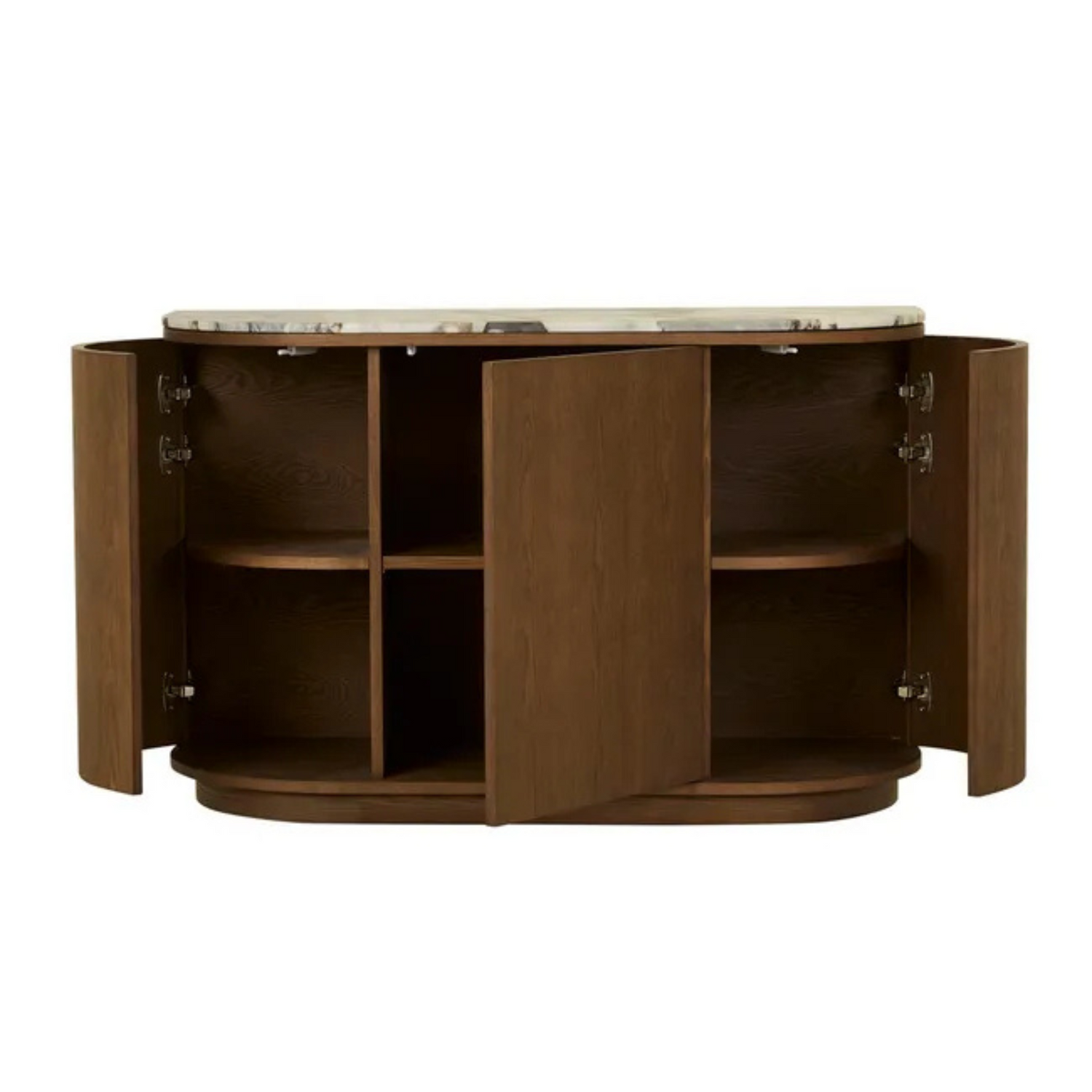 The Oberon Crescent Marble Storage Unit in Matt Ocean Marble and Smoked Ash offers a modern storage solution with a touch of elegance. Featuring a minimalist ash veneer construction and concealed storage behind curved doors and Hettich hardware, it provides both style and practicality. The marble top enhances its sophisticated look, making it ideal for contemporary interiors. This storage unit blends functionality with refined design.
