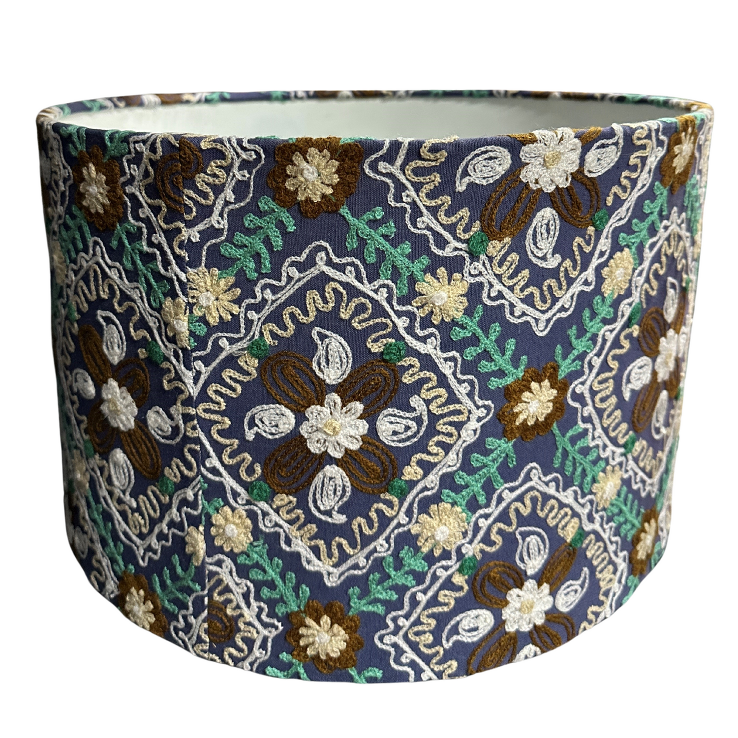 The Suzani Drum Lampshade enhances your indoor ambiance with its elegant design and intricate floral embroidery on a rich chocolate fabric. This sophisticated piece creates a captivating interplay of light and shadow, adding a subtle charm to any room.